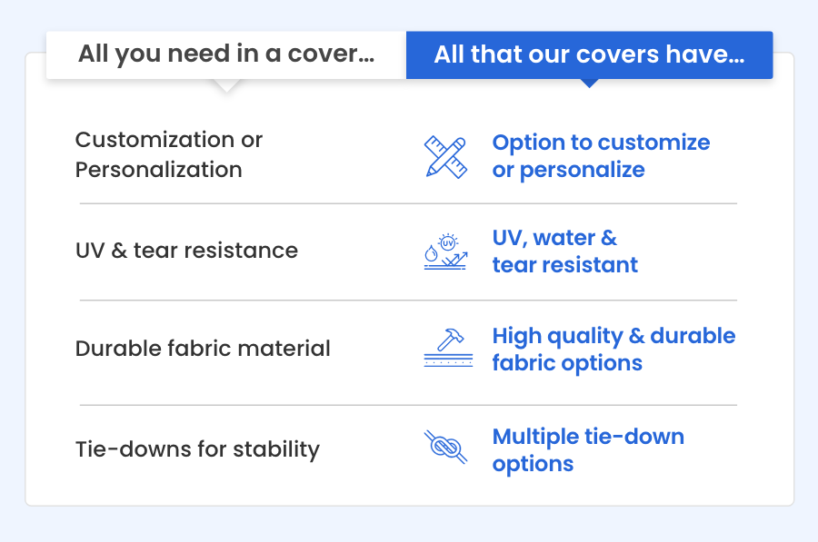 *T&C Apply. Free Shipping on orders above $99. Offer is valid for a limited period only. Max discount - $100 | | Covers&All is a part of Group Bayport, our esteemed parent company. As a global leader, Group Bayport with a family of 9 distinguished brands, specializes in customized solutions across three key categories: Signs & Displays, Covers & Tarps, and Home Decor & Lifestyle. | | 415 Horizon Drive 350 Suite, Gwinnett County Suwanee, Georgia 30024 | | | | |