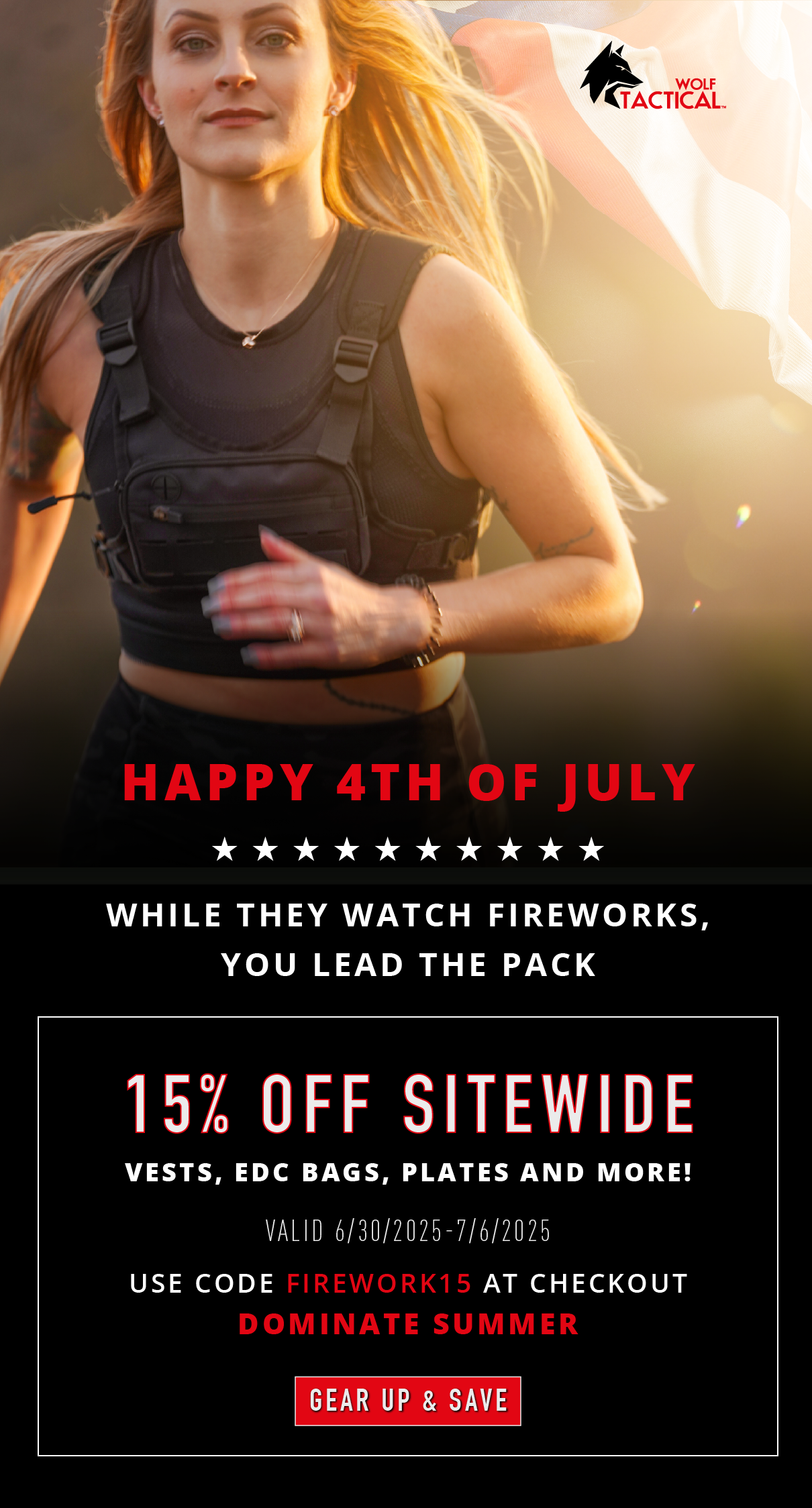 Special Offer Details: Apply code FIREWORK15 at checkout for 15% off sitewide. Offer valid 6/30/25-7/6/25. Current promotions are not valid on previous purchases or in combination with any other promotional offer. This offer is only valid in the US and for purchases on www.wolftacticalusa.com. All offers may be modified or discontinued at any time without notice. Offers are subject to adjustment due to returns, cancellations, and exchanges. | | © Wolf Tactical 2025 2014 Champions Gateway NW Suite 300 Canton, OH44700 No longer want to receive these emails? Unsubscribe. | | | | |