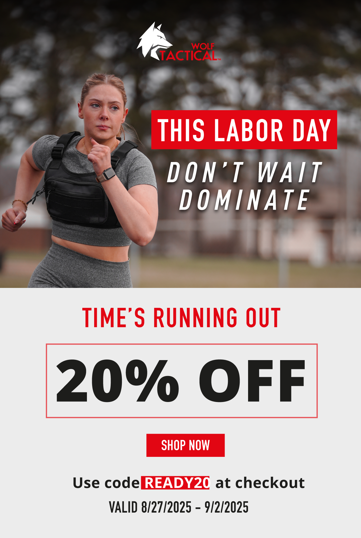 Special Offer Details: Apply code READY20 at checkout for 20% off. Offer valid 8/27/2025-9/2/2025. Current promotions are not valid on previous purchases or in combination with any other promotional offer. This offer is only valid in the US and for purchases on www.wolftacticalusa.com. All offers may be modified or discontinued at any time without notice. Offers are subject to adjustment due to returns, cancellations, and exchanges. | | © Wolf Tactical 2025 2014 Champions Gateway NW Suite 300 Canton, OH44700 No longer want to receive these emails? Unsubscribe. | | | | |