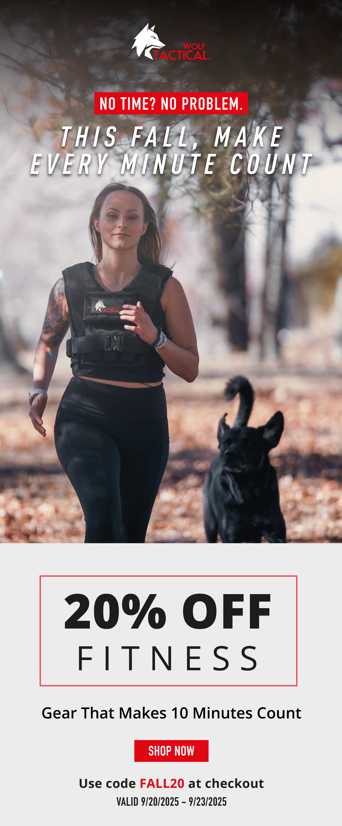 Special Offer Details: Apply code FALL20 at checkout for 20% Off Fitness. Offer valid 9/20/2025-9/23/2025. Current promotions are not valid on previous purchases or in combination with any other promotional offer. This offer is only valid in the US and for purchases on www.wolftacticalusa.com. All offers may be modified or discontinued at any time without notice. Offers are subject to adjustment due to returns, cancellations, and exchanges. | | © Wolf Tactical 2025 2014 Champions Gateway NW Suite 300 Canton, OH44700 No longer want to receive these emails? Unsubscribe. | | | | |