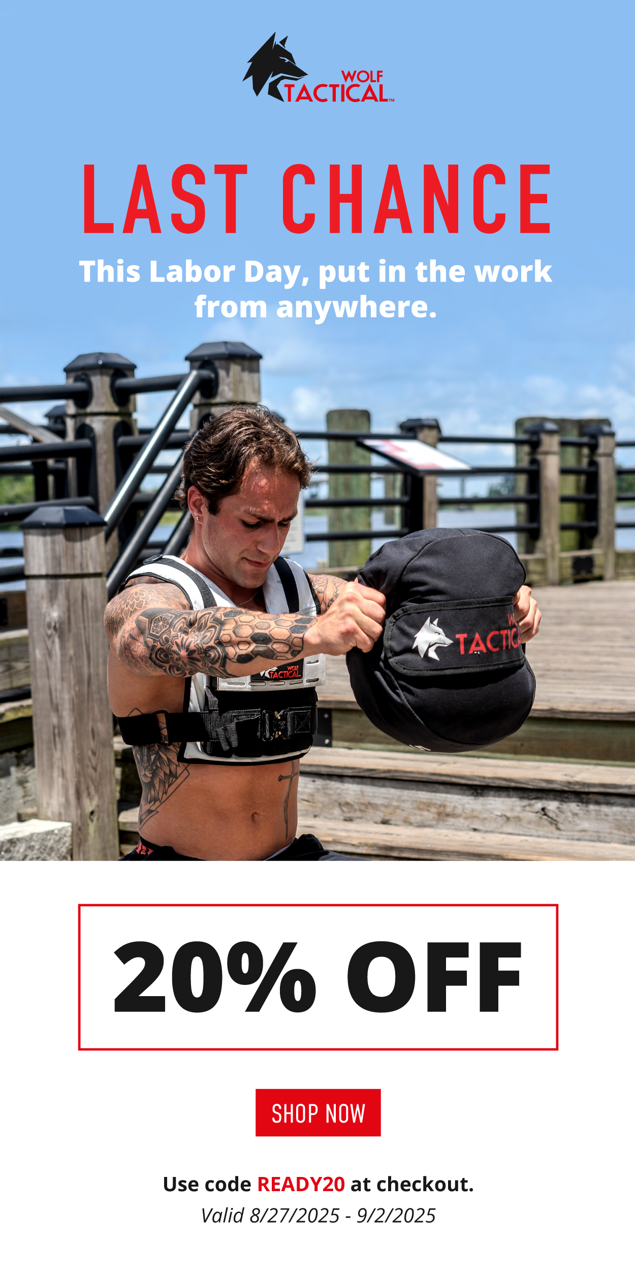Special Offer Details: Apply code READY20 at checkout for 20% off. Offer valid 8/27/2025-9/2/2025. Current promotions are not valid on previous purchases or in combination with any other promotional offer. This offer is only valid in the US and for purchases on www.wolftacticalusa.com. All offers may be modified or discontinued at any time without notice. Offers are subject to adjustment due to returns, cancellations, and exchanges. | | © Wolf Tactical 2025 2014 Champions Gateway NW Suite 300 Canton, OH44700 No longer want to receive these emails? Unsubscribe. | | | | |