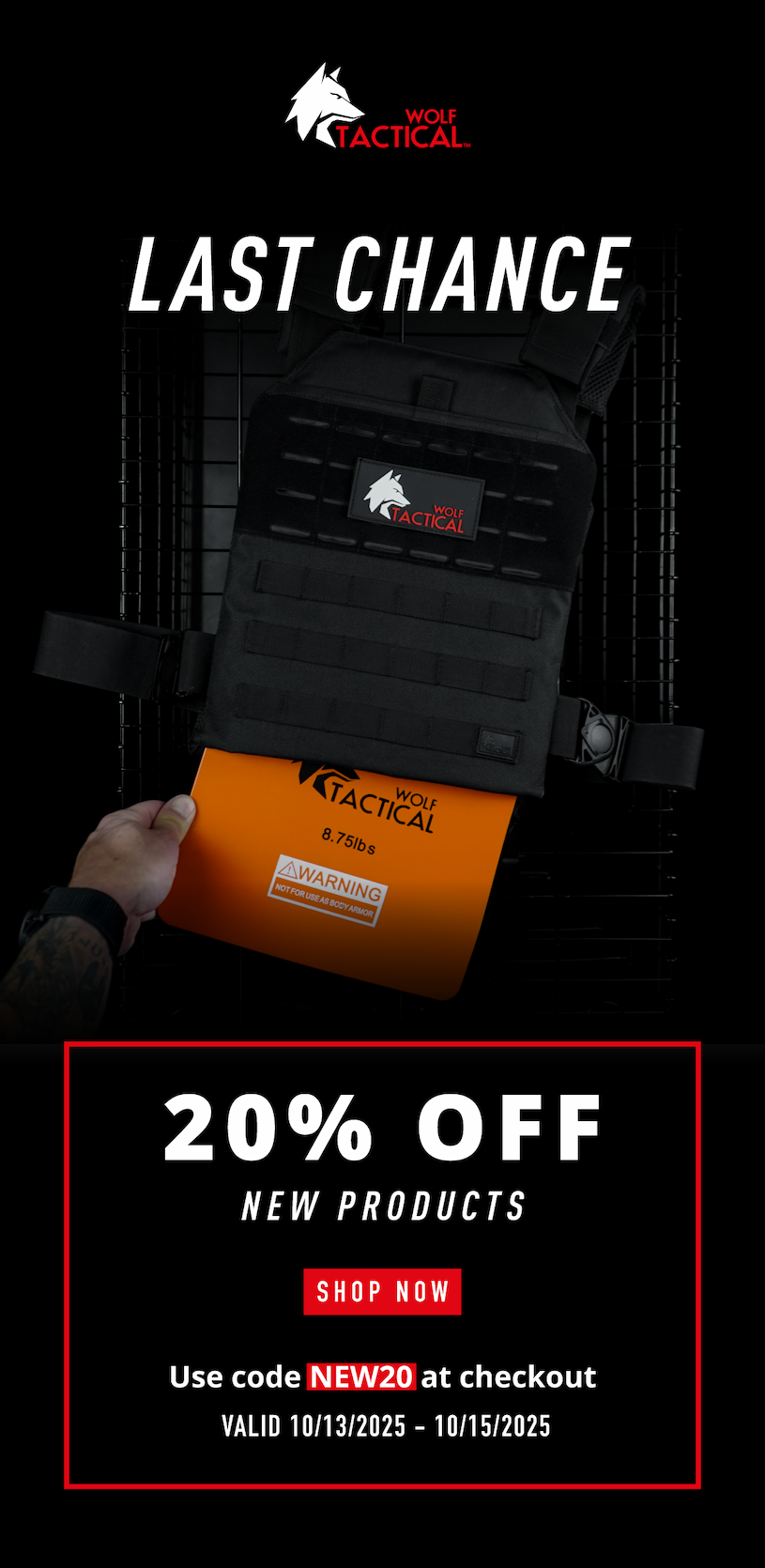 Special Offer Details: Apply code NEW20 at checkout for 20% Off New Products. Offer valid 10/13/2025-10/15/2025. Current promotions are not valid on previous purchases or in combination with any other promotional offer. This offer is only valid in the US and for purchases on www.wolftacticalusa.com. All offers may be modified or discontinued at any time without notice. Offers are subject to adjustment due to returns, cancellations, and exchanges. | | © Wolf Tactical 2025 2014 Champions Gateway NW Suite 300 Canton, OH44700 No longer want to receive these emails? Unsubscribe. | | | | |