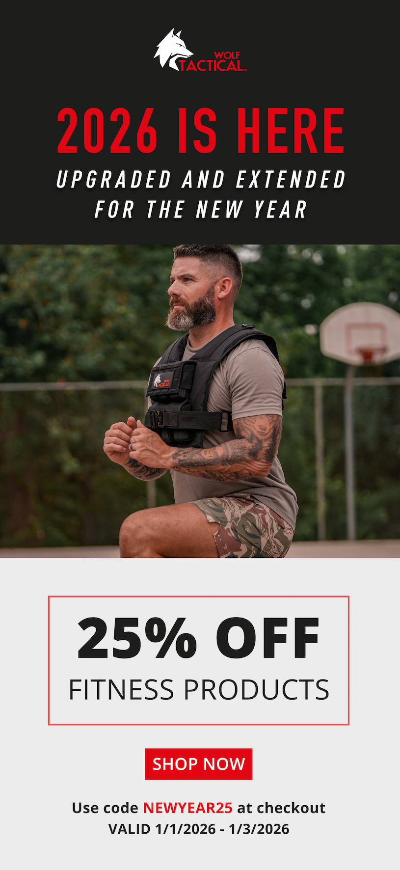 Special Offer Details: Apply code NEWYEAR25 at checkout for 25% off FITNESS. Offer valid 1/1/2026-1/3/2026. Current promotions are not valid on previous purchases or in combination with any other promotional offer. This offer is only valid in the US and for purchases on www.wolftacticalusa.com. All offers may be modified or discontinued at any time without notice. Offers are subject to adjustment due to returns, cancellations, and exchanges. | | © Wolf Tactical 2026 2014 Champions Gateway NW Suite 300 Canton, OH44700 No longer want to receive these emails? Unsubscribe. | | | | |