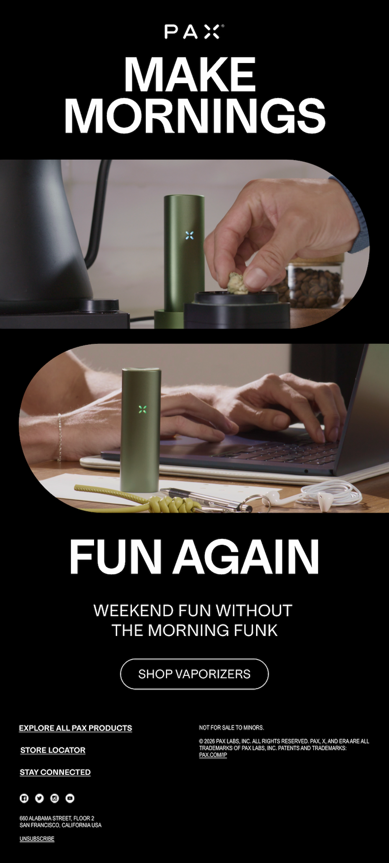 660 ALABAMA STREET, FLOOR 2 SAN FRANCISCO, CALIFORNIA USA | | NOT FOR SALE TO MINORS. © 2025 PAX LABS, INC. ALL RIGHTS RESERVED. PAX, X, AND ERA ARE ALL TRADEMARKS OF PAX LABS, INC. PATENTS AND TRADEMARKS: PAX.COM/IP