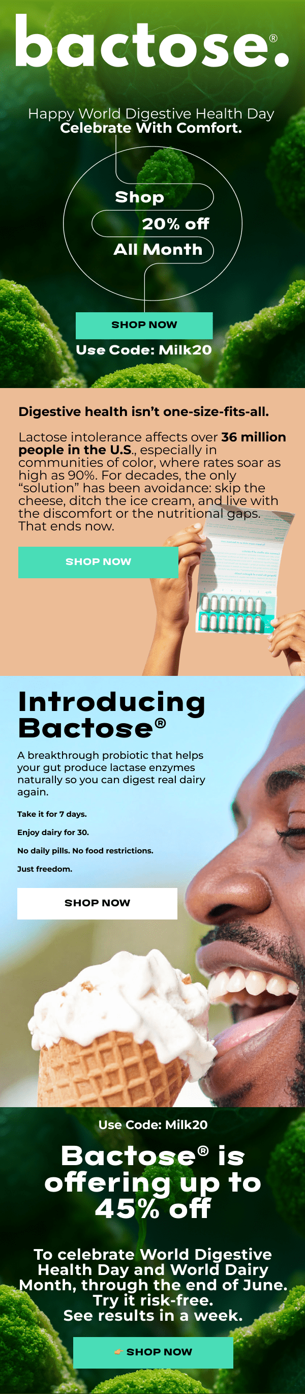 *THESE STATEMENTS HAVE NOT BEEN EVALUATED BY THE FOOD AND DRUG ADMINISTRATION. THIS PRODUCT IS NOT INTENDED TO DIAGNOSE, TREAT, CURE OR PREVENT ANY DISEASE. | | No longer want to receive these emails? Unsubscribe. Bactose 402 NE 194TH TER Miami, FL 33179 | | | | |