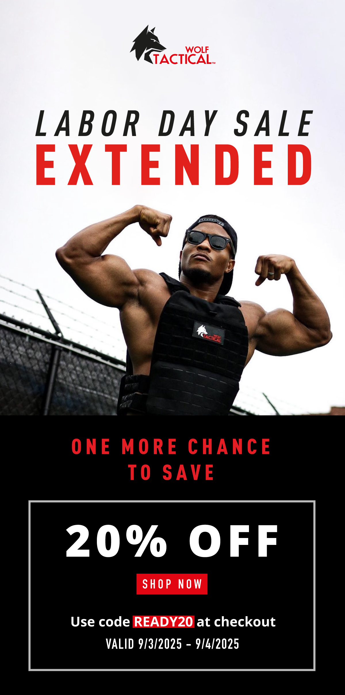 Special Offer Details: Apply code READY20 at checkout for 20% off. Offer valid 9/3/2025-9/4/2025. Current promotions are not valid on previous purchases or in combination with any other promotional offer. This offer is only valid in the US and for purchases on www.wolftacticalusa.com. All offers may be modified or discontinued at any time without notice. Offers are subject to adjustment due to returns, cancellations, and exchanges. | | © Wolf Tactical 2025 2014 Champions Gateway NW Suite 300 Canton, OH44700 No longer want to receive these emails? Unsubscribe. | | | | |