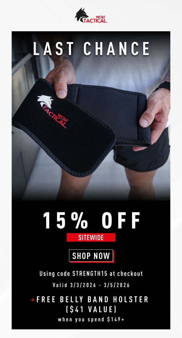 Special Offer Details: Apply code STRENGTH15 at checkout for 15% Off Sitewide + Free Belly Band Holster on orders $149+. Offer valid 3/3/2026-3/5/2026. Current promotions are not valid on previous purchases or in combination with any other promotional offer. This offer is only valid in the US and for purchases on www.wolftacticalusa.com. All offers may be modified or discontinued at any time without notice. Offers are subject to adjustment due to returns, cancellations, and exchanges. | | © Wolf Tactical 2026 2014 Champions Gateway NW Suite 300 Canton, OH44700 No longer want to receive these emails? Unsubscribe. | | | | |